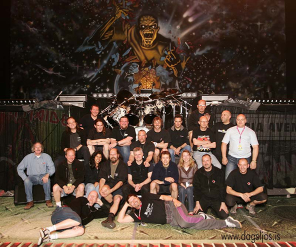 You are a bass tech for the most part. Do work with other instruments as well? 10. As I said, I think of myself as a utility man- whatever needs to be done, whether it be teching or playing- though I've never done any lighting. I tech bass because I work for Steve, and look after my own keys. I take care of all of the guys in the studio and in rehearsal a lot of the time- the guitar techs come in for the first day, then the last week before a tour- except for drums. I used to do that also, but it required too much time. Charlie's in for that, and Peter Clark before him. A lot of my studio duty is as the caterer! I did do Waddy's guitars for awhile recently, and look after myself, whatever I'm playing... 11. I started writing this while I was home before the tour, but after a few weeks of rehearsals in England in May, we are now a month or so into it- so far Czech, Poland, Austria, Germany (Rockamring/impark), Iceland, Italy, Portugal, Spain, Greece, France, Belgium, Norway and back in Germany at the moment . We continue through northern Europe and Scandinavia 'til mid-July, then to the States for Ozzfest, or at least most of it. We have to cut short to come back to England for the Reading and Leeds festivals and one in Dublin. I'm meant to be home early Sept. I hear the album will start next year, so I'll have a bit more time at home before being busy most of next year. I really should start doing more with my own stuff. I owe it to myself- to what end, I'm not sure...just to do it, I think, and see what happens. If I hadn't been on the road all of this time, I think I would possibly be producing now. I also like the idea of teaching. I was quite the student, and I have always said that I owe that kid a PhD before I die- anybody giving out life credits? I have talked to Cal State University @ Chico about the possibility. I have a little dome house in the hills up that way. I'm sure some of my future involves that. People keep telling me I should go into a rental business, put some of my gear to work for me. I tend to take things as they come... RCL -Q- It has been a pleasure talking with you Michael. This is your chance to plug your projects, websites, Tours, other bands or business's you would like to mention. Crew pic from Iceland 2005!! Click on image for blow up!! 12. I would like to take the opportunity to give proper due to my colleagues at arms. No man is a crew, and there are a LOT of people that make Iron Maiden happen. I present to you this tour's version of the infamous Killer Krew: Ian Day has been the tour manager for the last few tours; everybody seems to know Dayo...he gets around. Steve Gadd, Nicko's tech for a long time, graduated to asst. tour manager (he also does a lot of TM work). He was the drummer of the band 'Charlie'. Dicky Bell has been at the forefront of Maiden's production, in one form or another, than longer than any of us care to remember. We've got him back out on the road as PM for the first time in years. [I'm not sure who I feel sorrier for- us or him. ;-)] Legendary...("Get your hands out of your pockets!") Rebecca Storey, who was with Bjork for 12 years (! I bet that's an interesting gig.), is our new production assistant. She has to put up with Dicky Bell. (You tell 'im, mum!) Bill Conte is back with us this year as stage manager. He had a run with us in the 90's in a number of guises: rigger, lampy, props... Doug Hall, the front of house sound man, and I came to England together to work for the sound company that first put us with Maiden (Muscle Music). He has been there for every gig since 1980, more than I can say. I believe the quality he works at is some to do with why Maiden is where they are. He has also been doing Deep Purple, Testament and others. Mike Hackman is our system engineer of a few years. He keeps the EAW's in line... Steve 'Gonzo' Smith has been our monitor man since '90something. Other times, he's UB40's FOH guy. Top bloke! (and good bass player/singer in his own right, not that he does it much these days.) When he first arrived, Steve Harris came over and said, "He's done this before."