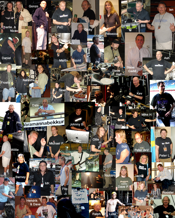 past...aka- the mad Swede (his words.) Natasha de Sampayo is our wonderful wardrobe lady of the last few years- can anyone actually smile that much? :-) Willie Whitelow, our very Scottish swag man from Bravado merchandising this tour; it's rumoured that language he speaks is English. ;-) We know him well. Johnny Burke is our IT guy, photographer, videographer, all things mac, no dairy products please; used to be with Def Leppard...Ollie Davis-Gardner- intern pro tools guy. 18, first time out. Steve Harris' daughter's boyfriend. (Oh boy, is he in trouble. ;-) Hard worker, good kid, does his job and more. When we pick up our own sound and lights, ML and Neg Earth supply them. Noise boys are our old boffin friend, head of security and Jonno Dunlop . N/E sends Richard Armstrong, Bob Batty ("Eeehhh-xxcellent!"), 'Goat' Hayden Corps and Luke Radin. They often get holidays while we are off doing festivals...For the beginning of the tour we had caterers Collette Shryane, Natalie Parkinson, Kais D'Arragi and Gemma Hammond from Eat to the Beat. Now that we're mostly doing festivals we use local. Our main bus drivers are Dave Good and Michael Prackweiser. Like I said, nice busses, good driving (no pun intended). Other drivers (sound/lights/catering and doubles) have been Rick Brammell, Trevor McCudden, Sven Schendel, Hans Schneider, Michael Dean (Big Clive) [my middle name is Dean!], Lucas Speckbacher...The freight arm of our transport division is made up of Kevin Barnes (Barney), Craig Jones (Rooster), Robert Brinkmann (Flip), Rachel Shadwick, Dave Ooms, Hendrik De Graff and no doubt a few others from Trans Am Trucking and Pieter Smits. From the Sanctuary office, Dave Pattenden joins us most weekends to liase for management (video production), as does Val Janes (marketing/publicity) on occasion. Johnnie Allen is our minister of procurement for all things gear related and other... he knows everybody, and is invaluable. Thanks for all of your assistance,
